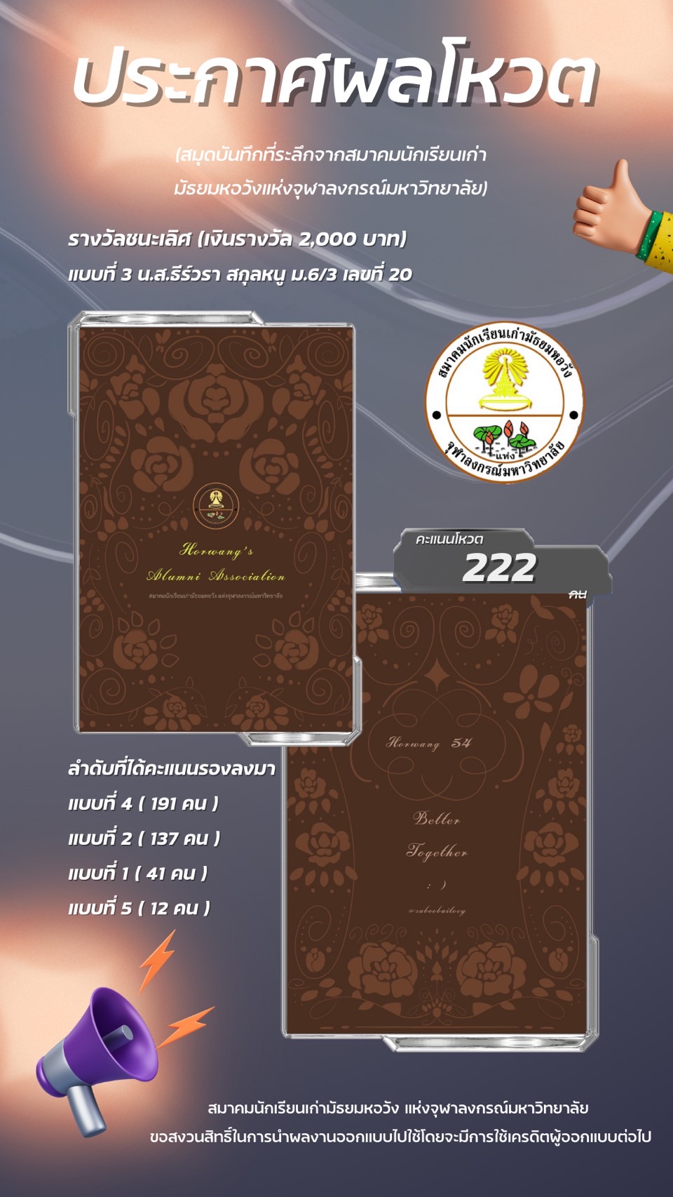 สมาคมนักเรียนเก่ามัธยมหอวังแห่งจุฬาลงกรณ์มหาวิทยาลัย จัดกิจกรรมปัจฉิมนิเทศให้กับนักเรียนชั้น ม.6 โดยจัดการประกวดออกแบบภาพบนหน้าปกสมุดที่ระลึก ที่จะจัดทำเพื่อมอบให้นักเรียนชั้น ม.6 ทุกคนในวันปัจฉิมนิเทศ โดยให้ลงคะแนนโหวตกันภายในระดับชั้น ม.6 และเลือกแบบที่ได้คะแนนโหวตมากที่สุด ซึ่งผลคะแนนโหวต ผู้ชนะเลิศ คือ นางสาวธีร์วรา สกุลหนู ชั้น ม.6/3 ได้รับเงินรางวัลจำนวน 2,000 บาทจากสมาคมฯ