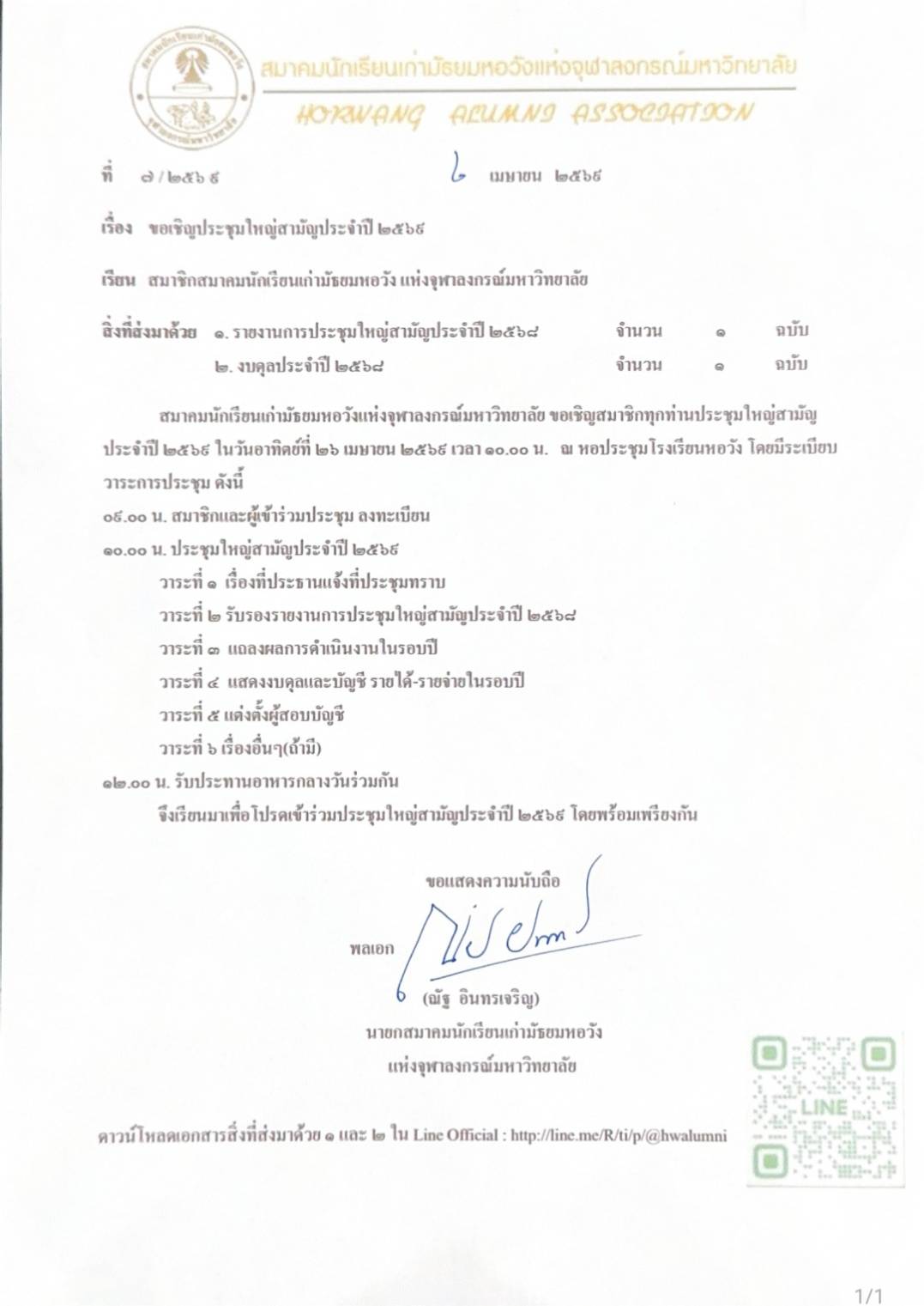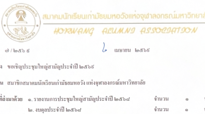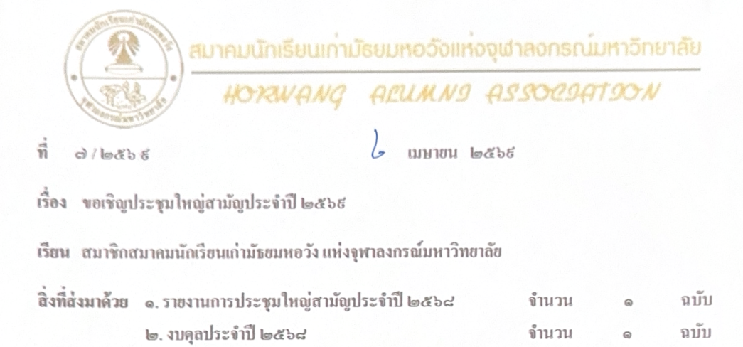 สมาคมนักเรียนเก่ามัธยมหอวังแห่งจุฬาลงกรณ์มหาวิทยาลัย ขอเชิญสมาชิกทุกท่านเข้าร่วมประชุมใหญ่สามัญประจำปี 2569 ในวันอาทิตย์ที่ 26 เมษายน 2569 เวลา 10:00 น. ณ หอประชุมโรงเรียนหอวัง